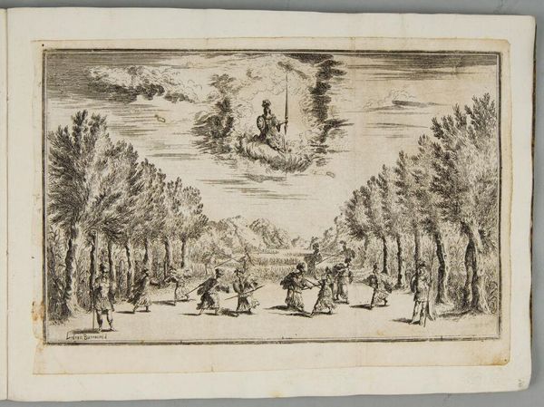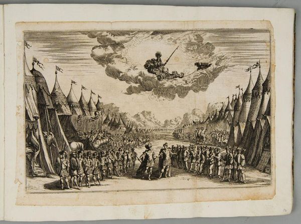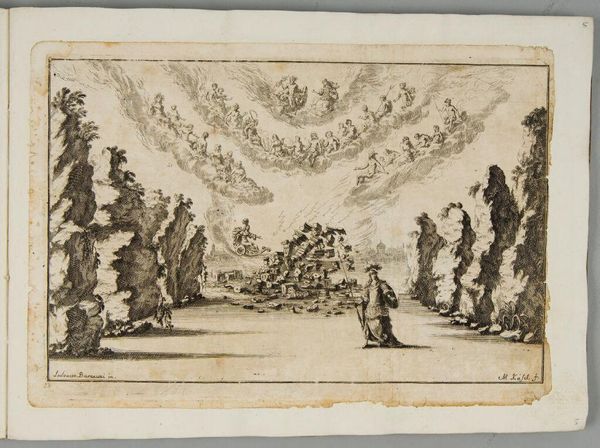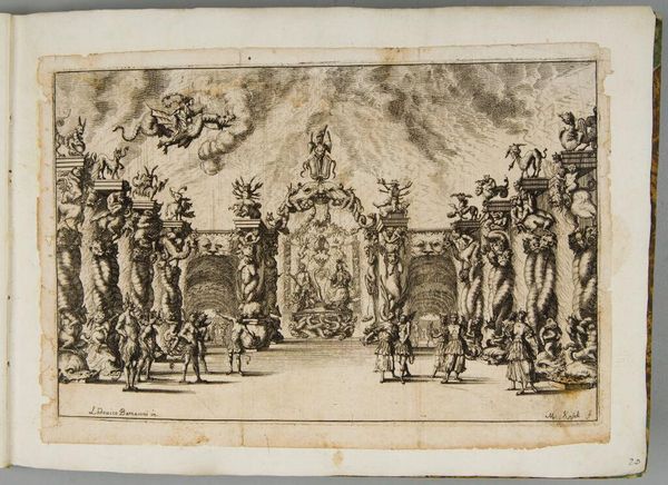 Editor: This is Matthäus Küsel's "Courtyard of the Palace of Paris," a small engraving that feels surprisingly theatrical. With all the figures and ornate architecture, what do you see happening here? Curator: It's a world of controlled spectacle, isn’t it? The courtyard is a stage, and the figures, both human and divine, seem to be performing roles. There’s a dreamlike quality, that cloudy scene above, a blurring of reality and fantasy that invites us to question what’s truly solid and what’s merely projected. Editor: That tension between real and imagined is fascinating. I hadn't thought of it that way. Curator: Think of it as a carefully constructed illusion, a reminder that even the grandest of palaces can be a stage for something more... ephemeral. Editor: A really powerful effect, now that I consider it. Thanks!
