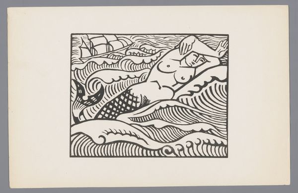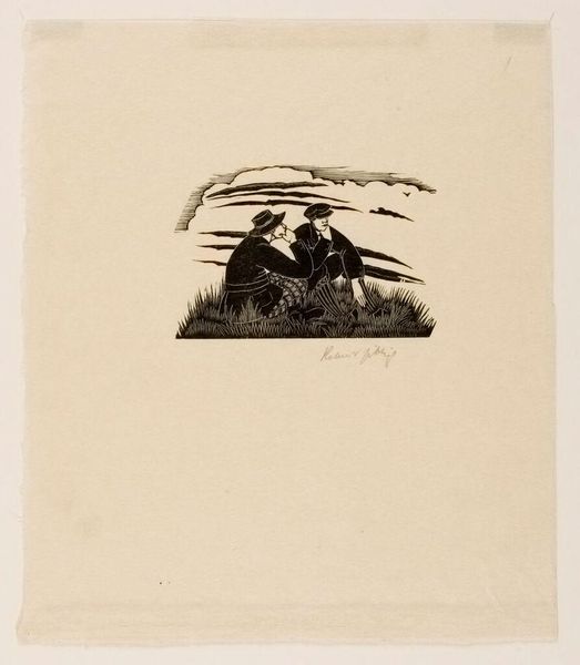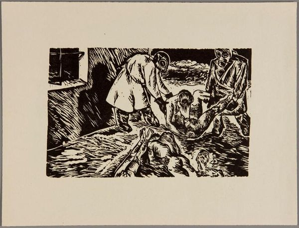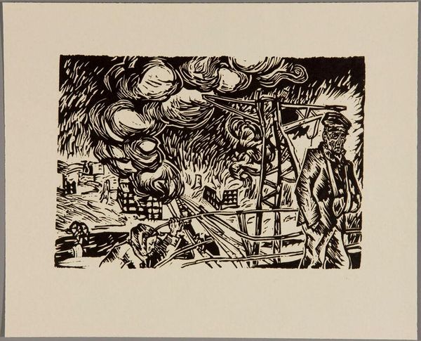 Editor: We’re looking at “Plate I” by Klaus Wrage, a woodcut print held in the Harvard Art Museums. The stark black and white contrast gives it a very dramatic, almost unsettling feel. What do you see in the composition of this piece? Curator: Indeed, the binary of black and white is paramount. Observe how the artist uses bold lines and contrasting shapes to define form. The composition seems to prioritize a tension between chaos and order. Editor: Chaos and order? How so? Curator: Note the angular lines converging behind the central figures, suggesting a vortex or maelstrom, yet these are contained within the rectangular frame. It creates a visual dialectic. Editor: I hadn't considered that. It’s more complex than I initially thought! Curator: Precisely. The artist invites us to consider the interplay of these formal elements.