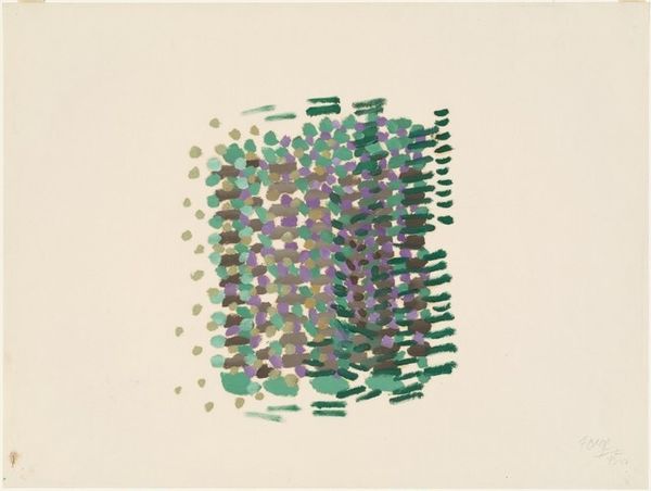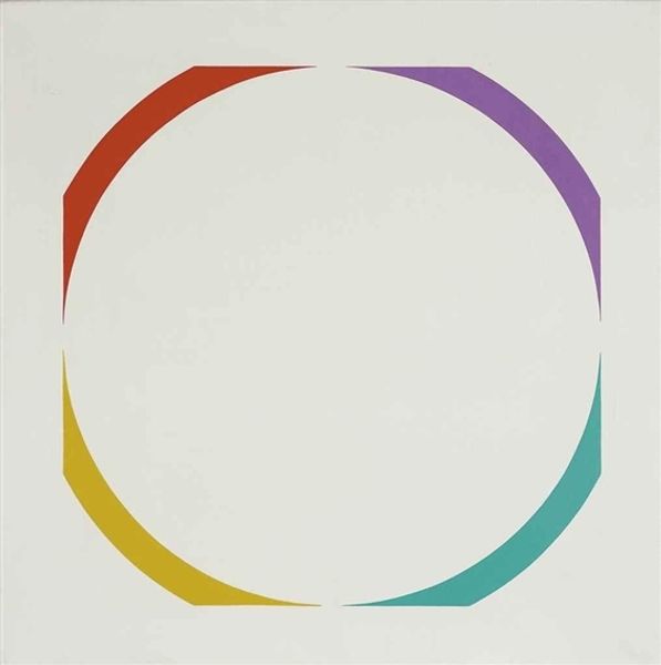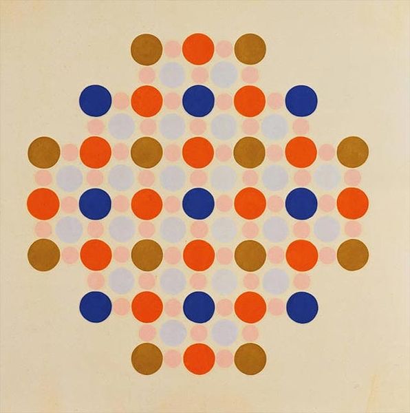 Thomas Downing made "Four Blue Five" with paint on canvas. It's all about the relationship between those flat, evenly spaced circles and the creamy off-white ground. The way the colors sit so calmly next to each other, it feels very process-oriented, like he set up a system and then just let it unfold. Looking closely, you see how thinly the paint is applied. It's almost like a stain, the canvas texture still visible underneath. There are no visible brushstrokes, so the hand of the artist is somewhat hidden. Each circle is a distinct decision, but together they form a larger pattern. This reminds me of the work of Ellsworth Kelly, who also explored color and form in a very direct way. But Downing adds a playful element with his unexpected color combinations and the way the circles seem to float on the surface. It's not just about precision, it's about creating a visual experience that's both calming and stimulating.