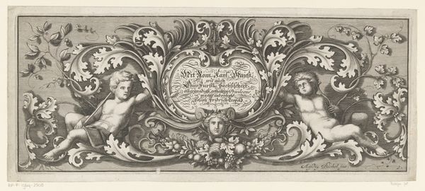 Editor: This is "Titelprent met putti en cherubijnen," or "Title page with putti and cherubs," created in 1604 by Raffaello Schiaminossi. It's an engraving, so intaglio printmaking, which gives it this incredibly fine detail. It feels almost overwhelmingly ornate, what’s your take on this work? Curator: It is a superb example of Mannerist printmaking circulating religious ideas. Look at the Latin inscription within the decorative border. Considering its public role, how might this print, likely part of a larger book, have functioned within the social and religious climate of early 17th-century Rome? Editor: So, not just a pretty picture, but a piece of propaganda? Curator: Propaganda is a loaded word, but in a way, yes. Prints like this helped disseminate and reinforce the doctrines of the Catholic Church, especially during the Counter-Reformation. The cherubs and elaborate frame aren't just decorative; they lend authority to the text about the mysteries of the Rosary. Notice how the artist has placed this image within a political and religious sphere. Where else might we find this artistic interplay with politics? Editor: Thinking about court portraits, maybe? Used to convey power through symbols and classical references. Curator: Exactly! And the distribution of prints democratized this imagery, moving it beyond the elite circles of the court. These images became widely available to reinforce the church's power structures across social strata. What does this say about access to art and the interpretation of its message? Editor: I never considered the accessibility factor. This makes me think differently about who was intended to view the art, and what influence art holds to shift power dynamics! Curator: It’s vital to remember art is rarely created in a vacuum. Context – religious, political, economic – deeply shapes not just what we see, but how it was originally intended to be seen.