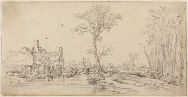 Dionys van Nijmegen created this landscape drawing with graphite, where delicate lines construct a serene yet somewhat ambiguous natural setting. The composition is anchored by a cluster of trees on the right, their forms loosely defined by layered strokes, which creates a sense of depth and density. On the left, a barely visible monument suggests a touch of classical antiquity, destabilizing the pure, untouched nature, infusing the image with a sense of historical reflection. The artist’s choice of medium, the humble graphite, enhances the sketch-like quality, emphasizing the process of observation and the immediacy of capturing a fleeting moment. The restricted palette invites us to focus on the interplay of light and shadow, which models the forms and articulates the pictorial space. Ultimately, it is the understated quality of the drawing, its quiet formalism, that encourages us to engage with the landscape on a more intimate, contemplative level.
