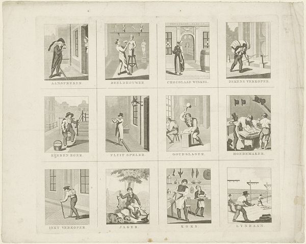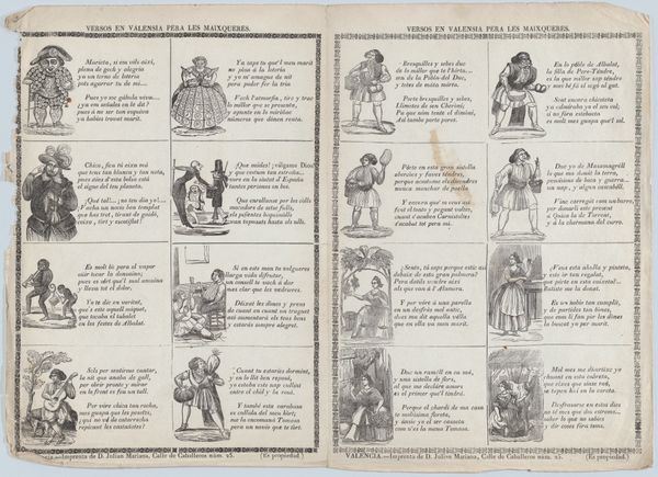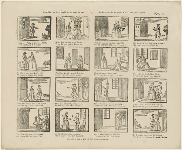 Editor: So, this print is titled "Wanneer gij graag vermaken ziet," which translates to "When you like to see entertainment." It's by Schalekamp & Van de Grampel, dating from 1822 to 1849. It feels a bit like a page from a storybook, with all these little scenes etched in fine lines. What catches your eye when you look at it? Curator: You know, it’s interesting, isn't it? Each scene is its own little universe of playful folly and courtship, little vignettes, full of… I almost want to say "anticipation." I imagine this hanging in a parlour, perhaps meant to inspire witty conversation, each panel prompting speculation on love, loss, and the general ridiculousness of people. Does the text underneath provide hints? What stories might each scene contain? Editor: The text seems to offer little rhymes for each picture, perhaps a commentary on the scene. I suppose each tiny tableau captures a specific, amusing social dynamic. So, were these kinds of prints common at the time? Curator: Absolutely! Imagine, if you will, that people living in the Netherlands during this period sought lighthearted stories about everyday people engaged in the rituals of entertainment and social bonding, a moral message to be gleamed through social observation of class and norms, a study of the ordinary presented as a spectacle... That's Romanticism, isn’t it? Look at the detail of those outfits! It all offers clues into a world where social amusement provided a reflection of the viewer's world. How are these little interactions applicable today? Editor: I guess it’s fascinating to consider how much has changed – and how much remains the same about our desire for connection. Curator: Precisely. And maybe that's the true pleasure, recognizing ourselves – flaws and all – in these little dramas from centuries ago.
