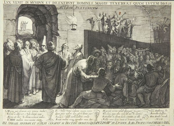 Curator: This print, titled "Plate 23: Conference on What Steps to Take Upon the Romans' New Troops Approaching Across the Alps, from The War of the Romans Against the Batavians," was created by Antonio Tempesta around 1611 or 1612. It's currently housed at the Metropolitan Museum of Art. Editor: Immediately striking. The sheer number of figures tightly packed together creates a sense of urgency and perhaps even panic. The contrast between the active figure in the foreground and the seated council behind him is quite compelling. Curator: Tempesta, working in the Baroque style, used etching and engraving to illustrate this historical event. It depicts a conference deliberating on how to respond to the approaching Roman troops, as they cross the Alps. The landscape with the tiny army marching along seems intentionally diminutive in comparison to the intensity of the conference itself. Editor: It makes you think about power dynamics, doesn’t it? This image represents that pivotal moment of discussion among decision-makers of different positionalities prior to conflict, a time charged with potential and fear. Who gets to speak, whose voice carries weight, what pre-existing allegiances will color their decision? Curator: Exactly! The scene is part of a larger series documenting the Roman-Batavian War, reflecting the political climate of the time and ideas of resistance against dominant powers. Consider how such imagery might have resonated in the context of 17th century European conflicts. It definitely plays into ideas of national identity and resisting foreign occupation. Editor: Absolutely. The strategic use of visual language, almost theatrical, invites us to interrogate the portrayal of Roman dominance and consider those who may not be readily apparent within such portrayals of authority, and what possibilities lay within negotiation, contestation, and peace. The choice to portray this moment—rather than any moment on the battlefield—is incredibly deliberate. It reminds us to reflect on the voices in such historical circumstances who called for another resolution. Curator: Tempesta gives us a moment steeped in its own historical milieu, allowing us to examine historical dynamics, and how visual imagery served particular socio-political narratives. Editor: And from that space we recognize that visual depictions from history often teach us so much about contemporary urgencies. It urges viewers to reflect upon what alternatives and peace resolutions they find within conflicts in their present.