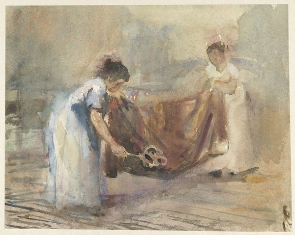 Curator: Rupert Bunny's "Chiffons," painted in 1917, depicts a woman carefully examining a piece of fabric. It's an oil painting, rendered in that soft, Impressionistic style Bunny was so fond of. Editor: It feels intensely intimate, doesn’t it? Like a stolen glance into a private world. The palette is muted, almost dreamlike, except for that burst of fiery orange in the bottom right corner. That single splash of bold color grounds it somehow. Curator: Absolutely. Bunny was fascinated by the leisured lives of women, particularly in domestic settings. He spent a significant part of his career in Paris, capturing these quiet moments of bourgeois life. It’s a painting of genre but with an obvious elegance and style, that you could even call modernism. Editor: Do you think it's just observation, or is there something more going on? I mean, what's she really seeing in that fabric? Is she dreaming of galas, or mending a tear with resignation? What kind of agency do these bourgeois women have beyond home confines? It is very different being a bourgeois in Australia as opposed to Paris, no? Curator: That's the question, isn't it? Is Bunny simply documenting, or is he offering a subtle commentary on the lives of women at this particular moment? Remember this was painted during the First World War, so beneath the seemingly tranquil surface, there would have been societal anxieties. In these interior settings of women, is it possible to consider this is also part of war effort? Editor: True. You see something else in this work the more we study it, a quiet hum of resilience, an almost defiance in continuing on. And how interesting it feels staged somehow. Like this could easily work as theatre. There’s such incredible visual storytelling present. The light almost spotlights her. Curator: It's also technically impressive. The way he handles the folds of fabric, the play of light on the woman's skin. You can feel the textures of the silk. There’s almost this gentle choreography between her dress, the cloth, the orange folds on the table… Editor: It is beautiful, certainly beautiful and unsettling. That intense private focus asks the question: are we intruding into this woman's quiet sphere? Or is this scene inviting, with Bunny himself asking if anyone cares to notice and observe what they are observing? I like it best that we may never truly know. Curator: It’s a beautiful picture which invites you to be at ease, but as we found out during our discussion it contains quite interesting ideas!