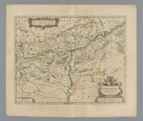 Editor: Right, next up we have a fascinating map: "Kaart van Gelderland" created in 1638 by Abraham Goos, utilizing etching techniques to capture the landscape. It feels so detailed, yet somewhat…fantastical, you know? Like a game board! What jumps out at you? Curator: Ah, yes! It's the perfect blend of art and utility. More than just directions, it’s a window into how people perceived their world. Notice how the landscape isn't just topographical but almost… alive? Little hills breathe, the rivers meander like thoughts. What do you think about the colours chosen, do they represent the reality of the landscape then? Editor: That's interesting. I hadn't thought of them being "alive" exactly, but now I see it. And, you’re right! The colors are interesting— not strictly realistic, perhaps more symbolic or conventional? It's mostly greens and browns, right? What do those choices communicate to you? Curator: Precisely! They set the mood, don’t they? In this period the brown hues spoke of cultivated lands, prosperity perhaps? And the greens... were a verdant hope for abundance, a deep, sustaining connection to the earth itself. Doesn't it make you think of something other than "just" a map? Something akin to… ancestral connection and home? Editor: I love that interpretation, Curator. It does! It makes me consider the stories these landscapes hold, the lives lived on that 'game board' we were talking about earlier. It's like… a cultural memory. Thank you. Curator: The pleasure's all mine! Sometimes the most ordinary seeming artifacts whisper the deepest stories of all. What's next?