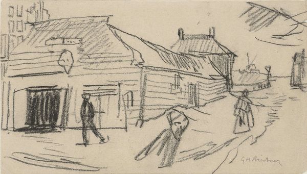 Editor: We're looking at "Huisjes aan een dorpsweg," or "Houses along a village road," a drawing using pencil and pen, created sometime between 1864 and 1936, currently held at the Rijksmuseum. The simplicity of the sketch really strikes me, almost nostalgic. What catches your eye in this piece? Curator: I'm drawn to the ways these houses are rendered not just as buildings, but as symbols of home, of shelter, perhaps even of rootedness in the Dutch landscape. Notice how the lines, though sparse, give weight to the thatched roofs, evoking a sense of protection. Does the monochromatic palette, devoid of vibrant colour, suggest anything to you? Editor: It almost feels like looking at a faded photograph, distant and dreamlike, which certainly feeds into that nostalgic feel. Curator: Exactly. The artist’s choice to depict this scene in such a muted fashion might speak to a yearning for a simpler time, a romanticised past where life revolved around community and connection to the land. How do the marks of the pen, scratching across the paper, strike you? Editor: They feel immediate and unrefined, like a fleeting moment captured quickly. They give the impression of the drawing being less about perfect representation and more about feeling. Curator: Precisely. The imperfections contribute to a sense of authenticity, reminding us that memory itself is rarely flawless. It's interesting to think how these houses might have been seen by the artist, not just as physical structures, but as containers of memory and experience. Editor: That's given me a whole new perspective; I hadn't considered the drawing as an act of preservation, of not just a scene, but also a feeling, a way of life. Curator: And that is a vital part of the power of art: visualising the familiar in an unusual way.