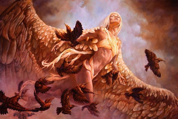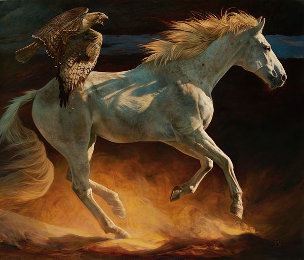 Editor: This painting, called "Exodus," is by Michael C. Hayes, and seems to be done in oil paint. The scene depicts a female knight on horseback, leaving what looks like a stone castle amidst falling autumn leaves. The overall tone is really somber, but there's also something heroic about it. How do you interpret this work? Curator: "Exodus," interesting title. This immediately makes me think about departures, forced migration, and even liberation. Looking at the lone female knight, it prompts me to question the narratives that often exclude women from positions of power and leadership. Is she a ruler being exiled, or is she leading her people to freedom? Editor: That's a really compelling reading! I was mostly just seeing a cool knight, to be honest. Curator: It is a very striking image, yes, and we can certainly appreciate the aesthetics and the technical skill. However, I urge you to consider what the artist might be saying about traditional gender roles, the hero's journey, and the concept of exodus itself. The imagery of the falling leaves and stone castle creates a sense of decay and vulnerability. Who does she represent? And from whose perspective is this narrative being told? Editor: The decay and vulnerability are visible but it’s interesting how those reinforce the need for leadership as a central theme. It reframes the focus on her positionality. Curator: Exactly! Thinking about contemporary issues surrounding representation and power dynamics enriches our engagement with this image. How can we relate her struggle to the struggles of marginalized communities today? The painting uses a traditional fantasy setting, but what can this artistic choice tell us about our own society? Editor: It really challenges us to look beyond the surface and ask those important questions. It is exciting to discover these deeper contextual layers. Curator: Precisely. Art becomes a powerful tool when it stimulates us to engage in discussions about identity, resilience, and justice. Hopefully our audience sees this perspective as well.