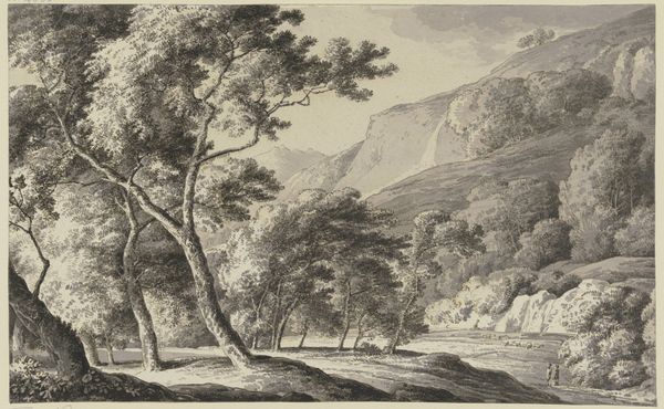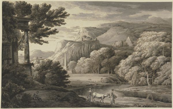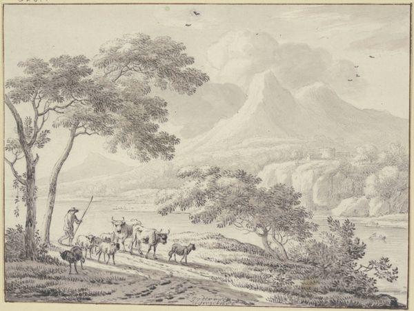 Editor: Here we have "Gebirgiges Ufer mit Kastell" – or, "Mountainous Shore with Castle," a drawing of sorts by Franz Kobell. It's quite serene. The muted tones create a wistful, almost dreamlike atmosphere. The castle seems so distant. How would you interpret the piece? Curator: The placement of the castle is very intentional. Kobell's landscapes reflect the societal fascination with picturesque ruins during the 18th century. These structures spoke to power, legacy, and the transience of human ambition. Consider where this was displayed; were these drawings part of an album sold to tourists? Did it play on specific aristocratic desires for property, influence, or a reflection on mortality? Editor: I never thought about the "tourist" aspect! That definitely puts the castle in a different light. So it’s not just romantic nostalgia, but also speaks to a market. The drawing itself is so delicate; does that contribute to this feeling of romanticizing history? Curator: Precisely! The medium matters. Pencil and ink allowed for detailed rendering, appealing to those desiring a tangible piece of the landscape they encountered, or perhaps *wished* to encounter. How does the soft, almost hazy application of the media alter our perception of power or the imposing nature of a fortress? Editor: So, by softening the reality, it made these places seem more attainable, more of a fantasy rather than a reflection of stark political power. I see now; it's less about military might and more about a certain kind of yearning. Thanks! Curator: Yes. Thinking about these landscapes as commodities designed to feed social and political fantasies adds another dimension to appreciating their artistry. We might consider what social classes were able to view these landscapes, whether it was an invitation to the elite and a view from afar for the peasantry.