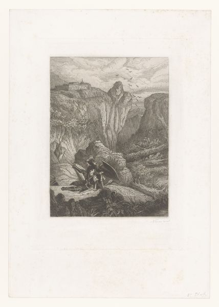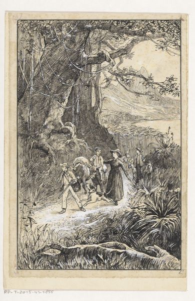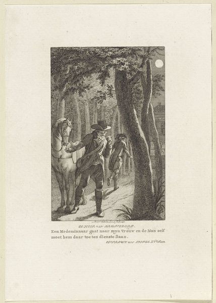 Curator: At first glance, this feels like an illustration from a fairytale, but tinged with a rather melancholic mood. Editor: Indeed. The piece before us is a print from 1922-23, entitled "Modes et Manières d'Aujourd'hui, Pl. 6: La Chasseresse" by Fernand Siméon. As part of a series, it’s presented as a fashion plate, but engages with much more complex ideas around gender and representation. Curator: A fashion plate? Really? With such dark lines, this looks anything but fashionable at first glance. More like a figure obscured by shadow, hidden away in a stylized forest. I’m struck by the rather unnerving way she’s turned away, eyes shielded. Editor: It's that averted gaze which draws me in. The 'chasseresse' – huntress – is almost an archetype here. Throughout history, the huntress figure carries the symbolic weight of self-sufficiency and the untamed woman, connected to nature, empowered and independent. Diana, for instance. Curator: Certainly. We see it even in contemporary portrayals, and it feels particularly significant during the interwar period. This image arrives just after women have fought for increased political participation, yet find themselves in a society that is also desperate to return to ‘normal’. To older structures. Editor: Notice the deer in the background, looking almost sorrowfully at the huntress. Siméon contrasts the fashionable figure with other potent symbols – the rabbits nestled near her feet represent fertility and vulnerability. The sleeping dog speaks of domesticity. Curator: Are we seeing then an argument for woman as part of nature versus woman confined by domestic expectation? It's a rather poignant tension rendered in these strong lines. She almost blends into the forest, while simultaneously wearing a distinct tartan skirt! Editor: Absolutely! Fashion here almost becomes a type of camouflage. A way to navigate these conflicting social expectations while remaining, to some degree, unreadable. Curator: It provides us with insight to the push and pull women would face post WWI; Siméon shows a woman both connected and at odds with her landscape, human and societal. Editor: The print becomes more than just an image of contemporary fashion; Siméon crafted it to hold our collective hopes and anxieties.