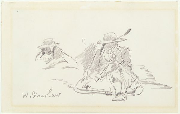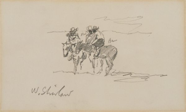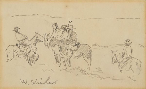 Curator: This quick pencil sketch, titled "Sketch made on Indian Reservation," was created by Walter Shirlaw around the late 19th century. What are your initial thoughts? Editor: It feels ephemeral. Almost dreamlike. The light, quick strokes of graphite give the scene a sense of transience, like the moment is slipping away even as the artist captures it. Curator: Indeed. Shirlaw’s use of readily available and inexpensive materials—pencil on paper—suggests the urgency of documentation and a desire for authenticity, sidestepping more laborious methods, potentially indicating a prioritization of field work. These qualities link it directly to academic-art, as you'll notice when looking closely at other sketches from this time. Editor: Precisely. I think considering it historically, its place is wrapped up in institutional representation, especially of indigenous peoples. The very act of sketching on a reservation – we need to think about power, cultural exchange and who gets to do the representing and how that's going to be received in public spheres. Curator: The composition is also telling. The figures and animals are grouped together, obscuring their individual identities, perhaps reinforcing stereotypes prevalent during that era. The question arises: Was this observation or interpretation? Editor: That's precisely what complicates things. Shirlaw has choices in materials available. So, how do we think about these quick sketches then as representations and how those circulate. Did he have the community's consent or engagement in what and how this image was going to be used later? Curator: Exactly. It makes you think about whose perspective is prioritized, especially considering the socio-political landscape when it was created. It also provokes me to consider the politics around depicting people of an under-represented nation as almost indistinguishable from pack animals... Editor: It adds a deeper layer of complexity, underscoring the politics inherent in representing indigenous communities through the lens of art. The use of that easily transported media, though perhaps necessary because of traveling from location to location to create these sketches, seems in direct opposition of those represented. Curator: These kinds of works make me really contemplate how deeply historical images have shaped our understandings and expectations of what indigenous communities looked like through the years and how museums present the artifacts left in their wakes. Editor: Agreed. This little sketch opens up so many important questions about labor, power, representation, and institutional narratives.