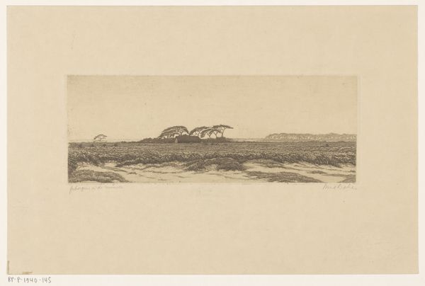 Curator: What a wonderfully somber landscape. Editor: It is striking. You're looking at David Young Cameron's "Dinnet Moor," an etching from 1912, here at the Art Institute of Chicago. It’s a moody composition in blacks and grays. The heaviness in the sky really pulls you in, doesn’t it? Curator: It does, though the most remarkable thing is the tangible impression of the artist’s hand through the etched lines on paper. This level of intimacy would depend on the tools available. What sort of etching needles, acids, and paper would have afforded Cameron this unique expressivity? Editor: The etching medium was incredibly popular in the late 19th and early 20th centuries, really opening printmaking to a wider group of artists and audiences. Consider its role within the broader context of the art market at the time. Curator: Yes, these landscapes provided artistic consumption for a middle-class clientele, feeding their idealized visions of the Scottish countryside. Editor: Absolutely, but consider the image itself: there’s a quiet, brooding beauty in the way Cameron portrays the terrain. It speaks to something more than just simple consumption. This moor, etched in 1912, reflects anxieties towards encroaching industrial landscapes of the modern era and idealized notions of rural living in Great Britain. Curator: Do you see any visible texture? I imagine the type of paper used impacts the quality of that black ink, affecting its texture. What happens when the paper’s acidity compromises its long-term preservation? Editor: Of course. Every element—paper, ink, the biting process itself—contributes to our understanding. I also see it through the lens of institutional representation, of how Cameron’s art entered collections like this and how it's circulated and interpreted. Curator: Those dark lines really capture the wild beauty. An intriguing and complicated history brought to life through an engagement of labor. Editor: Right, it invites further contemplation about what we value and why we’re drawn to these landscapes even today.
