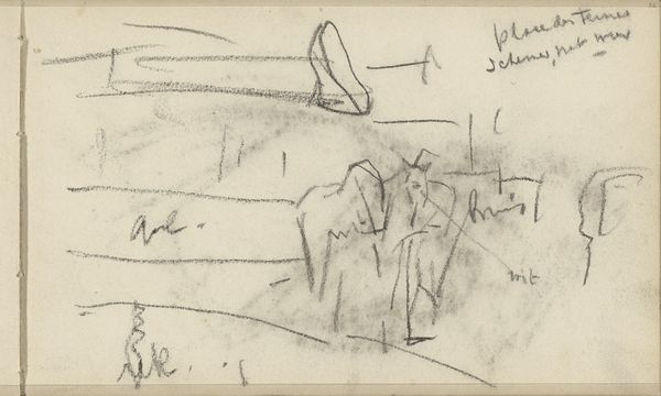 Leo Gestel made this drawing, Landschap met huis, with a graphite pencil on paper. This piece feels like a fleeting thought, a landscape barely registered before being swept away. The graphite is laid down in quick, almost frantic marks, capturing the essence of a house nestled within a landscape. It’s all about the process, the act of seeing and immediately translating that vision onto paper. Look at the vertical strokes suggesting the house’s walls. They’re not precise, but they convey a sense of structure against the more freely drawn lines of the surrounding landscape. Some scribbled notes beside the house add another layer. Gestel reminds me of Cezanne, capturing a scene not as it is, but how it felt to be there, a constant flux of impressions rather than a static image. It's less about what we see and more about how we see. It's this ambiguity that keeps me coming back.