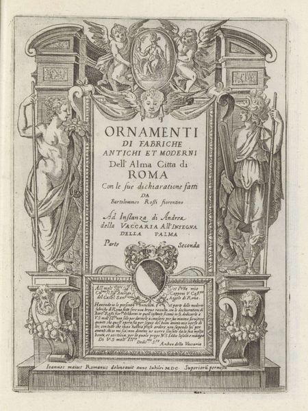 Editor: This is the title page to "Habiti antichi et moderni di tutto il mondo", or "Ancient and Modern Habits of the Whole World," a 1598 print featuring engraving and etching. It seems very elaborate for just a title page! What do you make of its overall design and message? Curator: Indeed! It’s critical to look past the ornate frame and ask ourselves: what narrative is this "world" actually constructing? The four figures, labeled "Africa," "Asia," "America," at the corners, tell a very specific story about power and representation, wouldn't you agree? Editor: It seems like each continent is represented by a... well, a character! Asia and Africa appear female, while ‘America’ isn’t labelled as anything at all... and they look like idealized versions. Curator: Exactly. Who is doing the idealizing? Remember that these images circulated within a European context during a period of intense colonization. These "habits"—clothing, customs—become objects of study and, ultimately, control. It’s about a gaze, a power dynamic being visually constructed and disseminated. What do you make of how the artist utilizes those visual cues? Editor: I see what you mean, now. The artist’s choice of what to represent, and how, becomes an exercise in defining "otherness." It’s pretty uncomfortable, to be honest. I was initially drawn in by the craftsmanship, but now I see how that skill serves a larger, more problematic purpose. Curator: Precisely. We should interrogate these historical representations, especially when they claim to depict "the whole world." That so-called "whole world" leaves out many voices. It urges us to examine who creates narratives, whose voices are amplified, and whose are silenced. Editor: Thanks! It’s really changed the way I understand this image – from a visually appealing object to something that actively shaped perceptions. Curator: Wonderful. Art history at its finest: we challenge inherited knowledge to illuminate marginalized people's experiences.