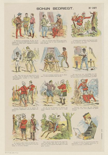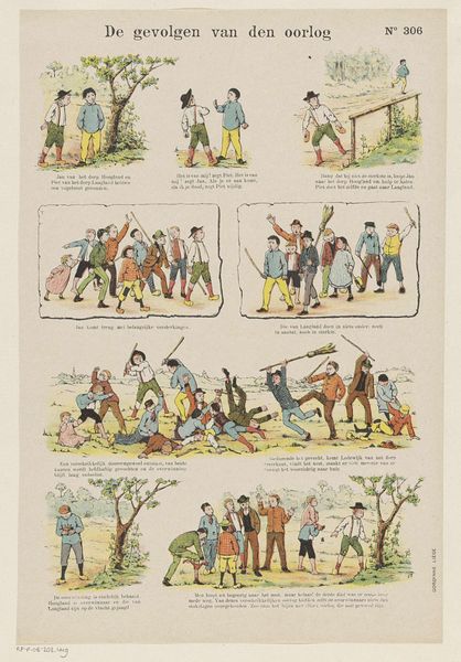 This comic strip, "De vliegende jicht van Toon," was created by the Monogrammist G.J., using color lithography. This process allows for the mass production of images, a notable shift from traditional art materials and processes. The artwork's appearance is influenced by its mode of production. Lithography allows for distinct lines and vibrant colors, enabling the artist to narrate a complex story through individual panels. Each panel is printed identically, pointing to industrial modes of production. This contrasts with the unique, handmade quality of traditional fine art. The techniques used here suggest the artist was not only a storyteller, but also a skilled craftsman. He was able to utilize a process of mass production to spread and display the story, and perhaps critique the social issues of labor and class, implicit in the story. Considering the materials, making, and context of this comic strip expands our understanding of its full meaning, challenging traditional distinctions between fine art and craft.