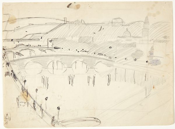 Curator: Looking at Inchbold's "Manzanares, Madrid", I'm struck by its dreamy, almost ethereal quality. The washes of color create such a soft, gentle atmosphere. Editor: It's interesting to consider how Inchbold, an artist associated with Pre-Raphaelite precision, here employs a much looser watercolor technique. Was this a conscious divergence, perhaps a comment on Realism itself? Curator: Absolutely. The placement of the bridge, the river, and the suggestion of figures invite questions about how public spaces have been represented, and more importantly, who has access to them. Editor: I agree, we should also mention the impact of the landscape tradition on British art institutions and their role in shaping national identity. Inchbold's work participates in a longer conversation about the construction of the picturesque. Curator: It's a potent reminder of the layers within even the seemingly simplest scene. Editor: Indeed, and a reminder of the evolving role of art in framing our understanding of history and place.
