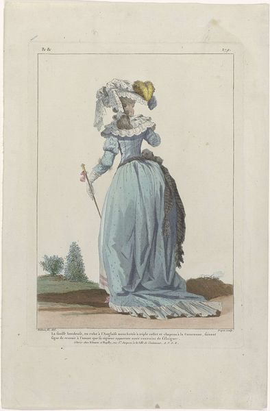 This hand-colored etching, "La belle du Matin en Caracot et Jupe á la Suzanne," or "The Beauty of the Morning in Caracot and Suzanne Skirt", offers us a glimpse into the performative aspects of 18th-century French aristocratic identity. Though the artist remains anonymous, the print vividly depicts a woman of leisure, strolling in the Palais Royal. Consider the deliberate construction of her image. The extravagant hat, the fashionable "caraco" jacket, and the "Suzanne" skirt are not merely garments; they are signifiers of status, taste, and participation in a culture of display. Her playful gesture of offering a sugared almond to a passerby hints at the flirtatious social interactions and courtship rituals of the time. It’s difficult not to consider how the artwork shapes and reflects societal issues, while also referencing the emotional and personal dimensions of the piece. This image invites us to reflect on the ways in which clothing and gesture were—and continue to be—used to convey identity, desire, and social power.