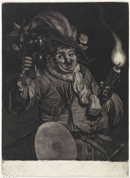 Editor: Here we have "Man Looking into an Empty Jug," a drawing using pen and charcoal, by Jan Stolker, from the Dutch Golden Age. It’s from around 1734 to 1785 and lives here at the Rijksmuseum. The lighting and soft strokes really create a feeling of pensiveness. What catches your eye about this piece? Curator: It is indeed a composition that hinges upon a central figure engaged in introspection. Notice how the artist has used hatching to sculpt the form, particularly around the face and the folds of the clothing. Consider, for example, the relation between the dark, dense strokes and the areas left relatively bare. What does that contrast communicate? Editor: I think it makes the figure really pop, like the contrast draws your eye in and highlights the subject’s expression. Curator: Precisely. And beyond the representation, we must look at the arrangement. The curvature of the jug mimics, in reverse, the slouch of the figure, thereby establishing a subtle visual echo that contributes to the piece’s overall sense of melancholic unity. Note, as well, the strategic placement of the light source, presumably from the left, illuminating specific planes of the figure and the jug, thereby enhancing their three-dimensionality. What compositional decision do you feel is most effective? Editor: For me, it is the detail of the hat. The textures create shadows that really add complexity to the head and command attention to the face. Curator: A keen observation. It seems clear, in scrutinizing Stolker’s drawing, that careful application of technique coupled with compositional balance gives this seemingly simple genre painting its enduring impact. Editor: I never would have considered the jug echoing the pose; seeing that adds a whole new dimension to the work. Thanks for sharing your perspective!