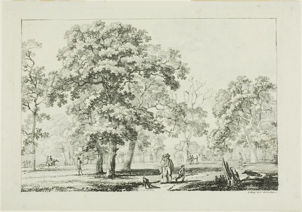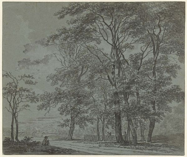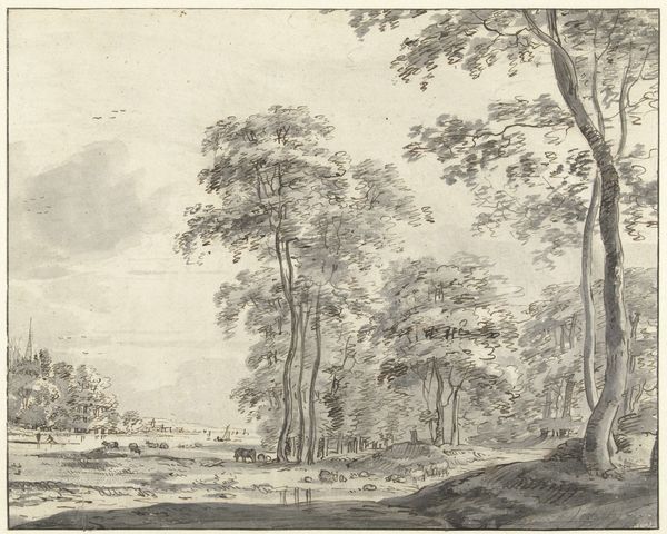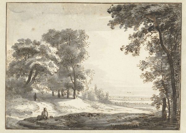 Johann Heinrich Müntz created this landscape drawing with ink and wash. The composition is structured by strong vertical tree trunks that frame a middle ground with two human figures. The figures are diminutive. Their inclusion, more than anything else, creates a sense of scale. This heightens the sense of the landscape’s depth, opening up a pictorial space and an atmospheric perspective, made all the more impressive by the tonal gradations of the wash. This all lends itself to an almost sublime reading of nature. But notice how the church spire on the horizon mirrors the form of the stark tree trunk on the left, thereby suggesting a kind of structural homology between nature and culture. Such formal mirroring asks us to reconsider the boundaries between the natural and the human-made. This drawing doesn't just depict a scene. It actively engages with how we perceive and categorize the world around us.