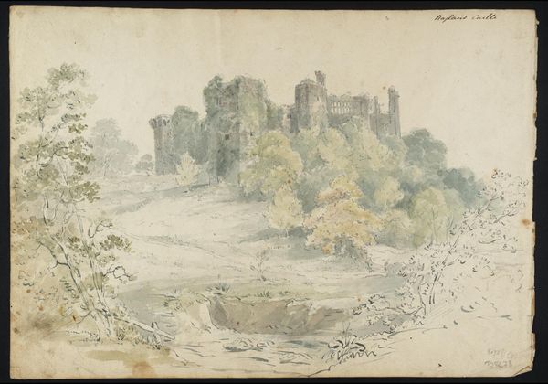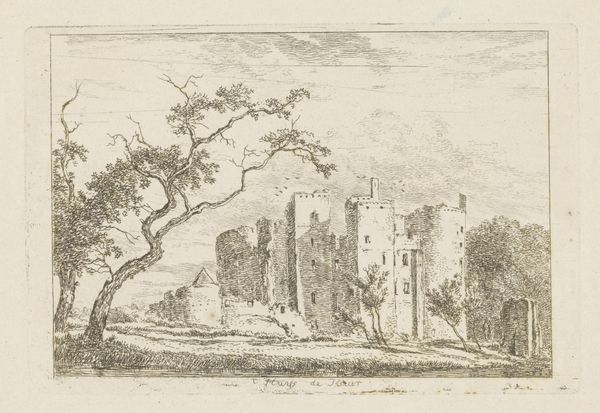 Curator: Welcome! We’re standing before Roelant Savery’s “Slot med skov til venstre. Schwamenburg Slot?” a drawing, likely done sometime between 1600 and 1700. Editor: My first impression is of a kind of quiet drama. The pale wash of the sky seems to weigh down on this imposing structure, while the forest on the left appears windswept, almost ghostly. Curator: Indeed, that stark contrast is interesting. Castles, of course, were not merely defensive structures, but powerful symbols of socio-political hierarchies. Note how Savery situates the castle on high ground—the trees on the left soften the image but cannot truly balance its authority. I wonder, who inhabited such a structure, and how did its imposing presence influence local populations? Editor: Absolutely, but look at how he's used tone. That towering structure mimics, in a way, the dynamism of the forest it contrasts, both rendered in shades of brown. The castle’s tower dominates – literally reaching for the sky. Towers are phallic symbols, a patriarchal claim to the surrounding space. Curator: An interesting read! Perhaps we could expand this into broader interpretations of the role of nobility as patriarchal structures. How the landscape supports these hierarchies needs further attention too. Editor: And note, the foliage softens the edges, creating a sense of timelessness. Castles are relics, memories, both protective and potentially dangerous. This artwork uses potent symbols of strength. The warm tones add another layer, hinting at both solidity and impermanence. Curator: Agreed. Impermanence is certainly present; even structures of power are not exempt from historical change. This piece raises the role of architecture and environment working to uphold—and ultimately challenge—inherited power structures. Editor: Exactly! It becomes a symbol open for us to ponder. A potent image, resonating through time and changing circumstances. Curator: Well, exploring its layered context and symbolism surely brings us closer to its complex place in the narratives of history. Editor: I agree. Thank you for a stimulating analysis, it shed so much light!