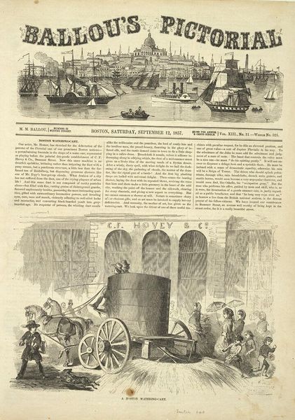 This print, "Corner of Winter, Washington and Summer Streets, Boston," was made by Winslow Homer and appeared in Ballou's Pictorial Drawing Room Companion in 1857. The image offers us a glimpse into the bustling street life of mid-19th century Boston. Homer's print creates meaning through the juxtaposition of social classes. The detailed depiction of fashionable pedestrians, horse-drawn carriages, and bustling commercial activity reflects the economic growth and social stratification of the time. This was a period when Boston's elite sought to emulate European urban life, while poverty and inequality remained widespread. The print’s publication in Ballou's Pictorial is important to note. As a popular illustrated newspaper, it played a role in shaping public perceptions of urban life and culture. To understand this print better, we can look at city directories, newspapers, and other periodicals of the time. Examining the institutional history of publications such as Ballou's Pictorial will help us better understand the social and cultural values that shaped artistic production.