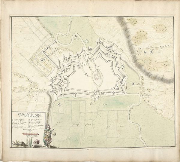 Curator: Here we have a remarkable piece: "Kaart van het Hoogheemraadschap van Schieland, met Gouda en Moordrecht," dating roughly from 1611 to 1635, made by Floris Balthasarsz van Berckenrode. It’s an ink drawing on paper. Editor: Immediately, I'm struck by how delicate the linework is. It feels almost… dreamlike, a landscape remembered rather than surveyed. Curator: In a way, you're right. Maps in this period weren't just about accuracy; they were about conveying power, ownership, and even aspiration. Look at the detail given to Gouda. The sharp lines depicting the bastion contrast with the watery, loose depictions of its watery environment. Editor: Indeed, that contrast highlights a fascination with controlling and organizing space, doesn’t it? You can almost feel the process—the handmade quality of it, each line drawn deliberately. What ink was typically used, I wonder? The color hints to gall ink… but of course, so many different possibilities with time. Curator: Precisely. And considering the importance of water management in the Schieland region—those drainage canals were vital! I imagine Berckenrode saw this work as more than just cartography. More so an imagining of how civilization tamed water, almost like a heroic struggle immortalized in ink. Editor: Which also speaks to a socio-economic layer of this work: consider how the control and maintenance of these waterways directly correlates to agrarian society. To chart the land, one must necessarily chart its workers too. A lot of it comes back to thinking about who benefits most from the art. Curator: It makes you think, doesn’t it? To create something that is useful, but has this aesthetic elegance, blurring that divide… It's truly captivating to consider, to stand here today at the Rijksmuseum and let it all wash over you. Editor: Absolutely. A convergence of nature, labor, material, and capital... What a view of seventeenth century Netherlands in a piece of drawing.