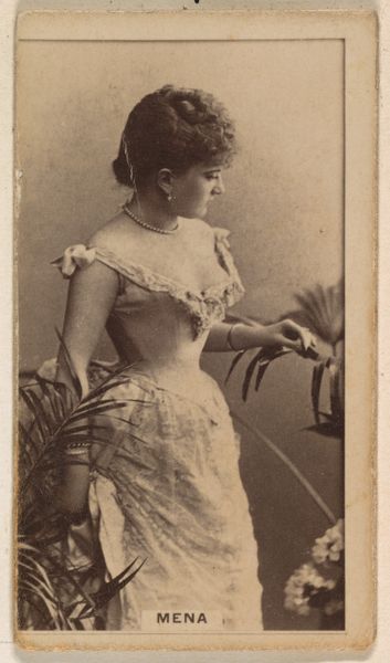 This photograph of Miss De Lorme, part of the Actresses series, was produced by the Wm. S. Kimball & Co. Made on paper using photographic processes, this card was one of many inserted into cigarette packs. This was a cheap, mass-produced form of advertising, capitalizing on celebrity culture and consumerism. The image itself shows an actress, likely posed in a studio, surrounded by exotic plants, a deliberate construction. The sepia tone, typical of early photography, gives the image a nostalgic feel, yet it was thoroughly modern at the time, as photographs could be reproduced endlessly. The card is small and light, an ephemeral object, yet also an artifact of a booming industrial era. Looking at this card, we see not just a pretty picture but also the workings of a complex system of production, labor, and consumption, blurring the lines between art, commerce, and everyday life.