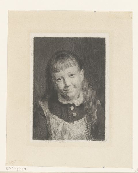Editor: Right, so next up we have "Portret van een onbekend meisje," or "Portrait of an Unknown Girl," created by Auguste Danse in 1895. It's a drawing and etching on paper. There's a sweetness to this portrait that's quite touching. What strikes you most when you look at it? Curator: That's a beautiful observation. You know, I feel a tender quietude emanating from her gaze, almost a pre-Raphaelite sentimentality captured in those delicate lines. The mystery of her identity also heightens the intrigue. Don't you find it fascinating that an unknown subject can still evoke such a personal connection? Editor: Absolutely. The lack of a known identity allows for broader interpretation, almost like a mirror reflecting our own emotions and memories. Do you think the medium - the etching and drawing - contributes to this intimate feel? Curator: Ah, a splendid question. Definitely! The etching lends a softness, a whispered quality. It feels like a fleeting moment captured, doesn’t it? I’m curious, does the dress seem like a costume, almost theatrical to you? Editor: Now that you mention it, yes! Perhaps suggesting a specific class or even aspiration? Like a visual clue dropped intentionally. Curator: Precisely! The bow seems strategically positioned, creating layers within the portrait. It’s these seemingly minor elements that truly captivate, wouldn’t you agree? Editor: Definitely. It’s made me think differently about portraiture, about the stories hidden beneath the surface. Thanks! Curator: The pleasure was all mine. Remember, art is a conversation, always shifting, always revealing new facets!