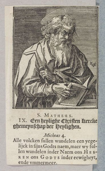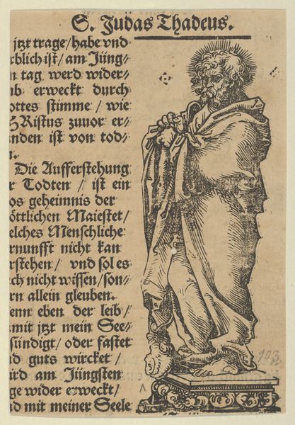 Curator: This is "Apostel Judas Thaddäus," made before 1646 by Christoffel van (II) Sichem, currently residing here at the Rijksmuseum. It's an engraving, a print showcasing a standing figure. My initial impression is its striking starkness – the contrasting lines really draw your eye. Editor: My first thought? Authority, and perhaps, weariness. He looks like a man who has seen a lot, holding a book as a symbol of faith, leaning on a staff for support. The lines forming his face tell a story of hardship, reflecting on the complicated role religion has played in different people's lives across the centuries. Curator: Right. What fascinates me are the lines themselves. Notice the variation in thickness and density—it's all carefully calibrated to suggest form and texture, and its mode of production points towards printmaking as a form of democratized imagery for broad consumption. The physicality of the plate, the ink, and the paper: each step is critical to the final object. Editor: Absolutely. And consider Judas Thaddeus's representation – not as an ethereal being, but a weathered man, close to the earth. What sociopolitical narratives do these engravings allow into circulation during this period, specifically around faith, community, and power? Curator: Precisely. Also the specific ways in which the plate itself degrades or is altered between printings. The small imperfections are telling. They’re not just copies; they’re unique material manifestations. Editor: Thinking about materiality also highlights how these religious figures, replicated and circulated, may become interwoven with other complex issues concerning cultural identities, class structures and so forth in early modern European history. It reveals much about the ways images operated. Curator: Ultimately, a testament to the power of accessible art, reflecting both skilled craftsmanship and cultural dissemination. Editor: An accessible format that leaves room for considering those excluded from religious canon.