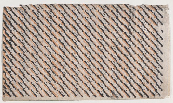 This sheet presents an overall pattern of stars inside ovals on textile. Immediately, one notices the rhythmic repetition of the design, creating a visual field that is both ordered and hypnotic. The stark contrast between the dark ovals and the light stars against a neutral background intensifies the pattern's impact. The anonymous creator utilizes simple geometric shapes – ovals and star-like figures – to construct a complex, all-over composition. This design could be viewed through the lens of structuralism, where the underlying structure dictates the surface appearance. The consistent application of these shapes speaks to a deeper semiotic system; each element serves as a sign, contributing to the overall message and aesthetic. This repetition creates a sense of infinity. Ultimately, this sheet challenges the traditional art object by prioritizing pattern and repetition over individual expression. This piece invites us to reconsider the boundaries between art, design, and the decorative arts.