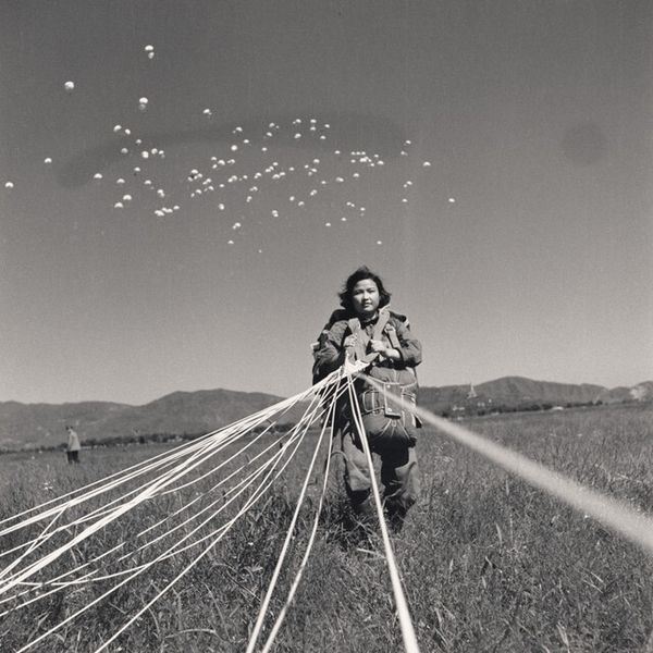 Curator: This is Robert Frank's "Mary and Pablo in high grass," part of the Tate Collections. It's a black and white photograph showing two figures amidst tall grass. Editor: My first impression is pure, unadulterated joy, radiating from the woman with arms upraised. The starkness of the monochrome adds a timeless quality. Curator: That gesture definitely speaks to freedom, almost a pagan worship of nature. And yet the boy seems far more contained, a contrast amplified by the grass as a concealing, almost tribal element. Editor: Structurally, the high horizon line emphasizes their connection to the earth and sky. Frank's use of high contrast intensifies the emotional charge; it's visceral. Curator: Frank was known for capturing fleeting, yet crucial moments. The photo seems to speak to a broader human connection to nature, a primal response to open space. Editor: Indeed. The composition pushes us to consider how light, shadow, and gesture coalesce into a charged representation of freedom and constraint. Curator: I'm struck by how this image, though simple in subject, carries so much about our inherent selves. Editor: It reminds us that even in black and white, life’s shades are deeply felt.