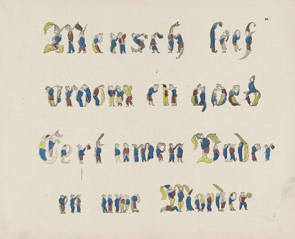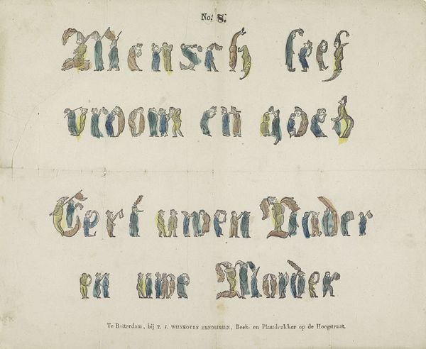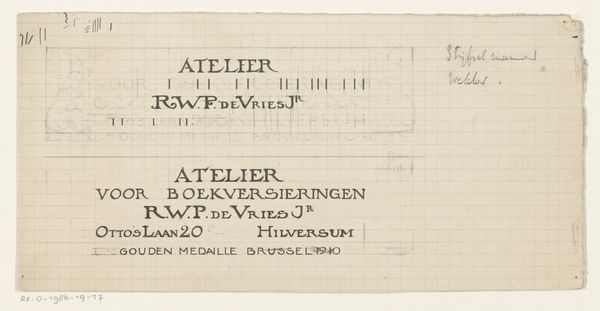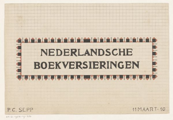 Editor: This graphic art piece, "Decoratief kader met de spreuk 'bitter in den mond maakt het hart gezond,'" or "Decorative frame with the saying 'bitter in the mouth makes the heart healthy'," created by Reinier Willem Petrus de Vries sometime between 1884 and 1952, is really striking in its simplicity. The color palette is muted, and there's something almost architectural about the layout. What do you see in it? Curator: Well, immediately, I see a rather clever visual representation of a proverb. That grid structure, to me, evokes both precision and constraint – a structured approach to something that feels inherently paradoxical. It's also undeniably Art Nouveau, don't you think? Editor: Yes, the geometric design definitely suggests Art Nouveau influences, although maybe a more restrained version. Is the 'bitterness' then related to such restraint? Curator: Possibly, but let’s probe deeper. The choice of typography feels so deliberate. Look at the firm lettering! Consider also, "bitter in the mouth makes the heart healthy"—it's a rather didactic little proverb. Now, consider, does art itself sometimes present us with uncomfortable truths? Editor: So, maybe the 'bitterness' is not restraint, but perhaps… unpleasant truth. The frame then reminds the viewer that they may need such truths? Curator: Exactly! It suggests that a healthy, full life needs some 'bitterness' to contrast with sweetness. Reinier seems to use design here as a philosophical reminder – food for thought, cleverly packaged. So, did it give you a slightly different impression, now? Editor: Absolutely, I now see it as a reminder of some kind. It’s clever how a decorative piece can carry such a thought. Thank you! Curator: My pleasure. Remember to keep tasting both bitter and sweet in the vast menu of art, for a healthy aesthetic heart.