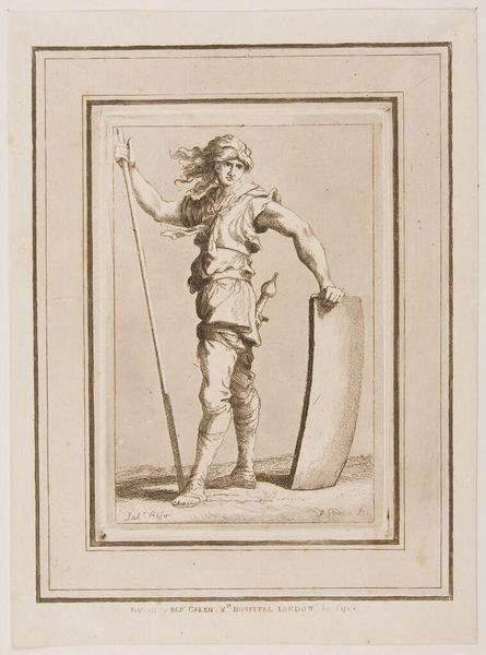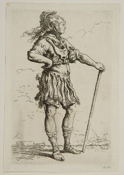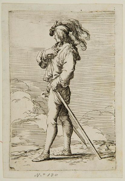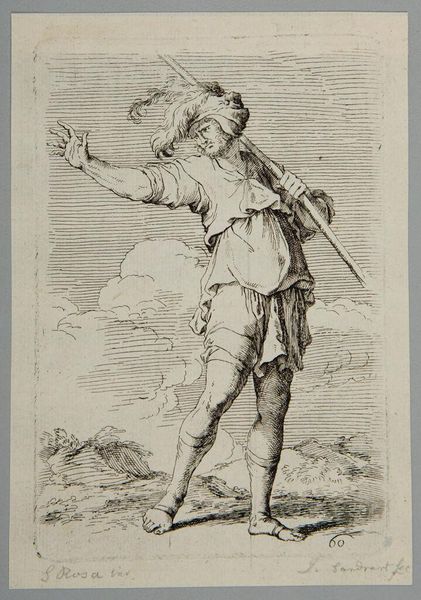 Editor: This is Bartolomeo Pinelli's "The Sweeper," an etching. There's such an interesting contrast between the figure and the vast landscape. What symbols do you see at play here? Curator: Notice the meticulous detail in rendering the "sweeper’s" tools, each element resonating with cultural significance. The broom, for instance, has deep roots as a symbol of domesticity. Editor: Oh, right! And it is connected to ideas of cleanliness. Curator: Precisely. Consider how Pinelli uses this figure against the open landscape. Does it prompt you to reflect on the symbolism of labor within society? Editor: It does! The placement emphasizes the role of the working class in the Italian landscape. Thanks for highlighting that. Curator: Of course! Examining such symbolic weight enriches our understanding of cultural narratives across time.