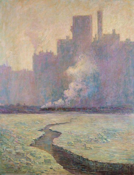 Curator: Ah, the coast… feels like a sigh doesn't it? This piece is titled "Cliffs by the Sea," painted in 1901 by Gustave Loiseau. I get such a strange feeling of familiarity mixed with distance when I look at it. Editor: It is muted. Intentionally so, I presume. The pastel sky, those dissolving cliffs. A hazy recollection, maybe a dream of the sea. There's a loneliness here. A quiet yearning, wouldn't you say? Curator: Absolutely. Loiseau was a master of capturing the transience of light and atmosphere en plein air. You can almost feel the salty air and hear the gentle crash of the waves. His broken brushstrokes are very emotive. You know, I've read some historians attribute this approach to the way capitalism erodes solid human bonds... What do you reckon? Editor: I think he saw beauty slipping through the cracks in modern life and perhaps a Romantic echo. I mean, plein air wasn’t new. The Barbizon school had been doing this for decades by 1901 and pushing it into something radical; painting as raw experience and an engagement with socio-economic relations that, if not critical, was certainly attentive to the human impact on the environment and the rapid modernization of French rural life. But the effect of light as it renders nature less objective feels closer to personal impressions, I find. I do see your point, it just has layers. Curator: Layers like the thickly applied oil paint itself! Look at how he builds up the cliffs. Almost like geological strata, recording the passage of time... and of course there’s something about what is being depicted that is just not modern – timeless! The man reminds me of my grandfather. Editor: This type of imagery in general offered a means for an increasingly urban populace to visually consume an idealized version of French life away from Paris and to consolidate cultural identity and the imagined roots. We see this now in tourist practices when seeking something ‘authentic’, far from home, in a place – where you’d feel nostalgia, longing, as if the site has lived forever... your point about the timeless cliffs really strikes a chord here. Curator: So, in some ways Loiseau becomes part of building national mythology and belonging? Hmm, intriguing. Well, regardless, its enduring appeal, I think, lies in its capacity to stir within us that quiet sense of wonder and awe. It makes me want to reflect, to dream. Editor: And reflect, and dream, we shall. The magic of history reveals itself one painting at a time, a lens refracting grand political projects into individual emotions and engagements.