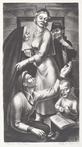 James Henry Daugherty’s “Lincoln’s Gettysburg Address” is an ink on paper work, but it feels like more than just a drawing; it's a whole world conjured from black and white. The cross-hatching gives everything a kind of nervous energy. It’s like the whole scene is vibrating with emotion, maybe from the sheer weight of the moment. Look at the way Daugherty uses light – those stark beams cutting through the darkness. There's a ton of drama there, right? The faces looking up at Lincoln have these exaggerated expressions, full of awe and grief. The texture is amazing. Like you could almost feel the rough wool of their coats, or the smooth marble of those gravestones in the background. It reminds me a little of Kathe Kollwitz, the way she uses stark lines to convey deep feeling. It's that kind of raw honesty that sticks with you. Art doesn't need to give you easy answers. Sometimes, it's just about wrestling with the big questions.