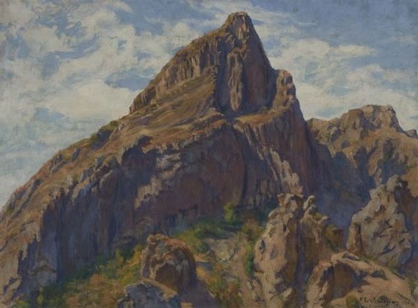 Editor: So, this is Armand Guillaumin's "Les Ruines Du Château De Crozant," painted in 1898. It’s an oil painting. There’s something wistful and dreamy about the ruined castle against that hazy sky. What jumps out at you? Curator: The subject matter, for one. Ruins became popular Romantic and then Realist subject matter. Why, do you think, did artists focus on ruins? This particular ruin carries a long legacy; by the late 19th century it was something of a tourist attraction, indicative of larger social forces connected to the rise of leisure travel. Guillaumin's interpretation highlights not just the physical decay but also hints at the fading significance of feudal power structures in a rapidly changing France. The soft, impressionistic style softens even further the historical connotations, domesticating them, if you will, for public consumption. Editor: So, he's presenting a kind of sanitized version of history for the middle class? That's interesting. I hadn't thought about tourism being so impactful on how artists portrayed historical sites. Curator: Precisely! And consider the technique. Oil paint was commercially produced, available to a much wider public and taught in numerous ateliers. The ruins, accessible. The paint, accessible. Is Guillaumin questioning or supporting the historical narrative represented in Crozant? Does this portrayal offer nostalgia, critique, or simply artistic exploitation of a visually compelling site? Editor: I suppose a bit of all three? Maybe that tension is what makes it so compelling. I see the piece in a whole new light. Thanks! Curator: My pleasure. Reflecting on how institutions, technologies, and cultural trends influenced this artwork has changed my perspective on Guillaumin.