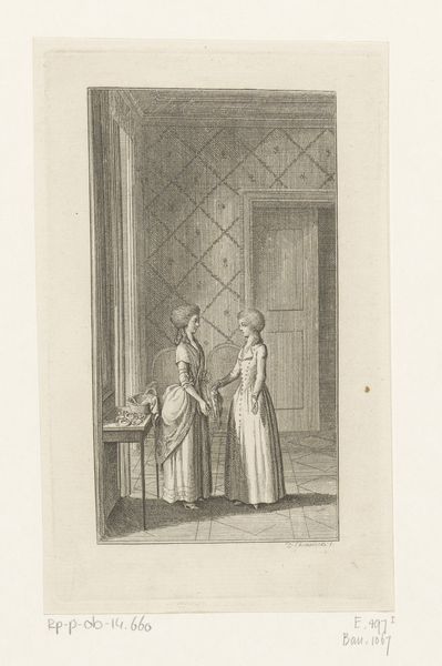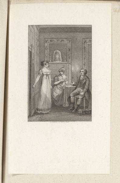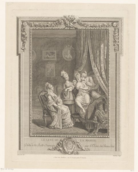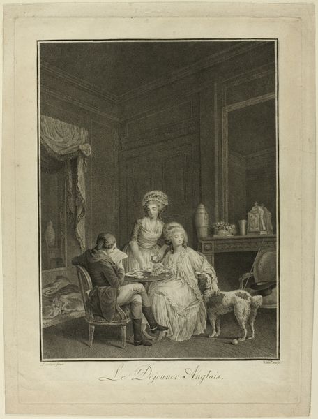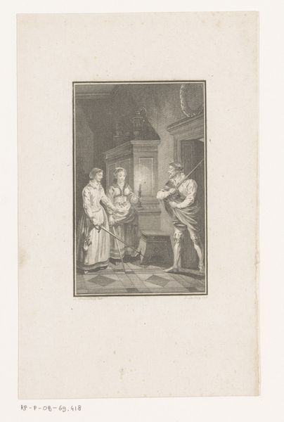 Editor: Okay, so we're looking at "Interior with Two Women and a Nobleman," an engraving by Louis Michel Halbou from around 1781. It's definitely got that late Baroque vibe. The composition seems… well, melodramatic. What do you see in it? Curator: Melodramatic! I love that. It's almost stage-like, isn't it? A brief moment plucked from a much grander, probably rather scandalous, play. And isn't it wonderful how Halbou captures this air of heightened tension using just lines and shading? It feels like we've stumbled into a secret encounter. One woman seems distraught; the other, confrontational, while the nobleman—with his powdered wig and that vaguely guilty look—is clearly the source of it all. Tell me, what do you think that other woman is feeling? The one off to the side? Editor: I see your point about it being staged! The woman on the right looks defeated and sad, almost like she's been betrayed, but maybe she is in on some larger scheme. There's a performative aspect to her posture as well, so perhaps that's it? Curator: Precisely! It's a drama of social convention, whispered secrets, and romantic entanglement. That quiet sadness feels all the more profound given the theatricality surrounding it, doesn't it? I imagine Halbou relished capturing these complex layers with his needle. He had a slyness to him, that Halbou. Editor: Definitely more layers than I initially thought! Curator: Ah, and isn't that the joy of art? What starts as mere image can transform into a reflection of a whole world, of ourselves, in a surprising reflection on past lives and dramas? Editor: Right! It becomes less about "what" it is and more about "what it evokes."