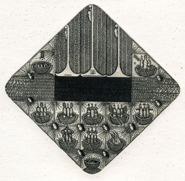 Oleksandr Aksinin made this Exlibris of Eduard Gorokhovsky, using ink, with a clear focus on a detailed process. It’s a world of tiny marks, each one precise and deliberate. The surface is a landscape of texture, built up from countless dots and lines. Look closely, and you’ll see the ink isn't just flat; it has a slight relief, a physical presence that invites you to touch, even though you can’t. The density of the marks varies, creating areas of light and shadow that give the image depth and complexity. Notice the central image of the bottles and bowl, how the black background makes the image pop. The marks become like little coded messages. I can't help but think of Paul Klee, who similarly transformed simple lines into complex, imaginative worlds. Like Klee, Aksinin shows us that art is less about what you see and more about how you see, embracing ambiguity and encouraging us to find our own meanings within the work.