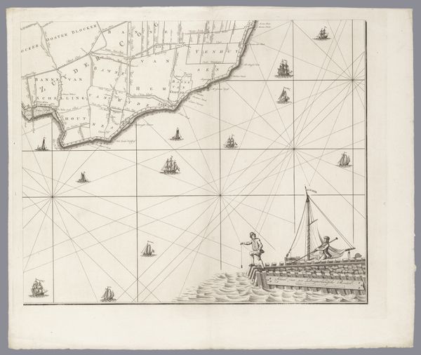 Curator: Before us, we have Coenraet Decker's "Kaart van Kennemerland en West-Friesland (dertiende deel)," a map created around 1680. It's part of the Rijksmuseum's collection. Editor: The stark lines immediately make an impression, almost clinical, despite the clear hand that crafted them. Look at the paper; you can almost feel the roughness, the way it might have resisted the engraver's tool. Curator: Decker wasn’t simply depicting geography; he was also mapping power, ownership. Note the meticulous detail of land divisions, illustrating control over resources. These maps weren't passive representations. They actively shaped perceptions and solidified Dutch authority in the region. Editor: And consider the materiality. It's ink on paper— humble stuff. But the labor involved in creating the intricate lines of this engraving tells a story of skilled craftsmanship. The sheer time to make something so meticulous would be substantial. Curator: Absolutely, but consider, too, the rise of cartography in this period. Amsterdam was a center of trade and colonial ambition; maps became strategic tools for navigation, resource extraction, and consolidating empires. These maps reflected the wealth accumulation facilitated by this precise knowledge. Editor: It’s fascinating how an ostensibly functional item reflects the whole social order of the time. Think about the accessibility – who was intended to consume this image? Was it the landed gentry? The merchants deciding shipping routes? How were such images disseminated, reproduced, and received in that specific moment? Curator: Excellent points. Furthermore, the ‘Maris German’ title, gesturing to the wider North Sea, reflects the expansive ambitions of Dutch maritime power. The map, far from a neutral object, participated in asserting dominion. Editor: It's a perfect example of how seemingly 'objective' representations can embody the complex social dynamics. Studying its creation and its function gives us a tactile connection to the past. I also just love seeing those tiny boats sailing along the bottom! Curator: Indeed. Decker’s map invites us to contemplate the ways in which knowledge is inextricably bound up with power. Editor: I’ll remember to think more about labor the next time I’m blindly following a map on my phone. Thanks for the insights!