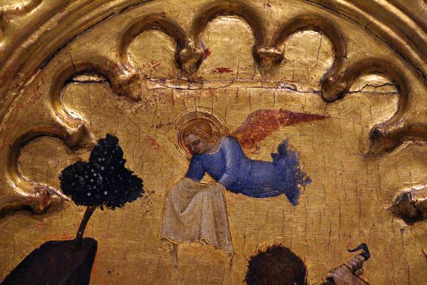 Here, we have an image of stained glass created by Sarah Purser for Loughrea St. Brendan's Cathedral. The artwork is bathed in hues of reds and oranges, anchored by the dark lines of the glass divisions, with white at the far right. The composition centers on an angel, who is set against a deep red background. She is playing a harp, its golden strings glowing warmly. The color choices evoke an emotional intensity and a sense of warmth, which can have a spiritual element, particularly within a religious setting. The angel's presence, combined with the musical instrument, forms a visual language that speaks to the sacred stories, and inspires contemplation. Purser's selection of warm colours and dynamic composition provides an interpretation of traditional religious themes in the context of the early 20th century. It is an invitation to reflect on the interplay between faith, art, and cultural identity, and how the past is reimagined through visual representation. The visual interplay captures a moment, and also opens up conversations about art's ability to bridge historical narratives with contemporary insights.