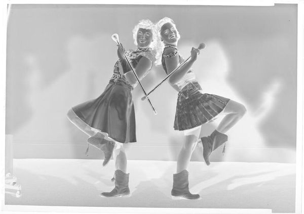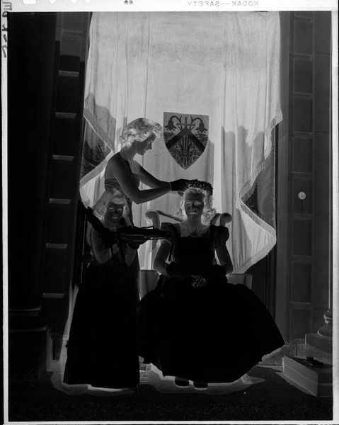 Curator: This is an intriguing, untitled photograph by Lucian and Mary Brown, housed here at the Harvard Art Museums. Editor: Brrr… it's eerie! The inverted tones give it a ghostly feel, like a forgotten memory surfacing from a dusty attic. Curator: Indeed. The composition is quite formal, two young girls in matching dresses positioned symmetrically against a blurred backdrop. Note the stark contrast created by the reversal. Editor: It almost feels unsettling, like a still from a vintage horror film. But there's also a tenderness there, something poignant about their matching outfits and tentative smiles. I wonder what their story is? Curator: It's precisely that ambiguity that I find so compelling; the image invites introspection about childhood, identity, and the passage of time. Editor: True. It's a reminder that even in the seemingly ordinary, there's always a hidden depth waiting to be discovered.