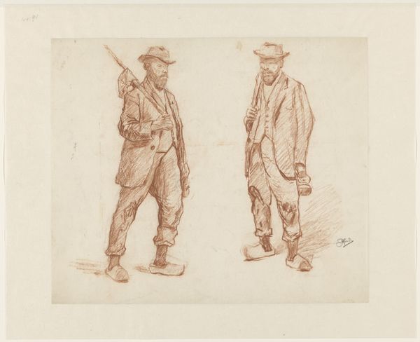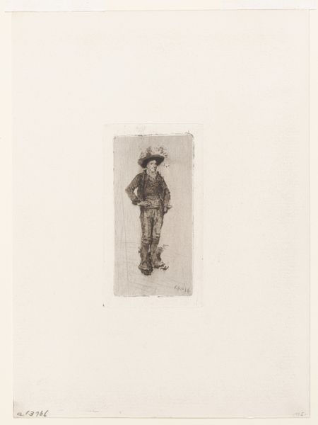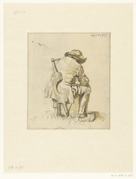 This drawing, "Man with hat on and bare legs standing on a scaffold" was made by Wouter Johannes van Troostwijk around 1809. Executed with graphite, the drawing is characterized by delicate lines that define the figure and the surrounding landscape, creating a contemplative mood. Van Troostwijk’s composition is structured around the solitary figure, whose downward gaze and relaxed posture suggest introspection. The artist uses the linear quality of the graphite to create subtle tonal variations that give depth to the figure's clothing and the texture of the wooden scaffold. The man is positioned on a structure, possibly a pier, with a distant cityscape sketched in the background. Semiotically, the man's attire which clashes with his bare feet creates a visual code that invites us to question traditional categories. Through his expert handling of the medium, Van Troostwijk invites us to reflect on the relationship between man and nature, and the complexities inherent in human experience.