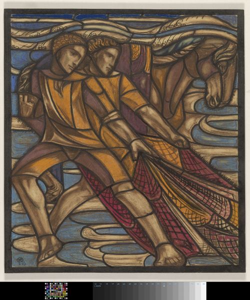 Curator: We’re looking at "Ontwerp voor raam in het Nederlands Paviljoen op de tentoonstelling Arts Décoratifs te Parijs, 1925" a design for a window in the Dutch Pavilion at the Paris Decorative Arts Exhibition, created in 1925 by Richard Nicolaüs Roland Holst. It employs tempera and drawing techniques. Editor: My first impression is its contemplative mood; the figures almost seem suspended in a moment of profound stillness. The composition with geometric patterns enclosing the figures, it feels both intimate and distant. Curator: Yes, Holst's choices in the division of space—each form is deliberately outlined—establish a visual language emphasizing the artificial construction, typical of Art Nouveau but verging into something…stricter. The figures themselves become architectural elements within the broader design. Editor: From a historical perspective, the 1925 Paris Exhibition was crucial for solidifying Art Deco’s aesthetic reach globally. Given this was for the Dutch Pavilion, how might we consider its contribution within the narrative of Dutch identity on the world stage during the Interwar period? What kind of cultural dialogue was Holst participating in? Curator: The interplay between figuration and geometric abstraction is significant. We see figures embraced inside the stained window in the foreground and in the background, a mountainous scenery, a starry sky with the moon and sunlight. Semiotically, we may look at these forms beyond their referential meanings; Holst's manipulation of colour and form achieves a flattened, almost medieval sense of space. It transcends merely illustrating figures; instead, we receive constructed visual poetry. Editor: Right, the stylized treatment hints at the ongoing tensions between tradition and modernity that characterized Dutch design during the period. Presenting his work at the Decorative Arts Exhibition signals a conscious engagement with wider European artistic trends. And stained-glass window, generally ecclesiastical or bourgeois, is the stage for presenting national identity on display, for both domestic and foreign spectators. Curator: Looking closely, notice the almost total absence of shading—it emphasizes surface texture above depth. The chromatic selection favors blues and earth tones, constructing not so much realism as a harmonious, symbolic organization. Editor: This piece offers valuable insights into the negotiations of national representation in international contexts. Understanding Holst's project in relation to prevailing cultural dialogues of his time enables a richer interpretive experience. Curator: Agreed, a work rich in layered aesthetics, that demands a multi-angled interpretation.