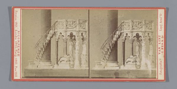 This image is a photograph of the Fontein met Mozaïek, taken in Pompeii by Photographie Artistique. The stereoscopic format, with its subtle duplication, invites us to explore the interplay between surface and depth, reality and representation. Notice how the fountain is structured through geometric shapes: the rectangle of the basin, the arch of the alcove, and the triangle of the roof. The mosaic patterns, rendered in grayscale, create a complex texture that contrasts with the smooth surfaces of the stone. The photograph's composition is symmetrical, with the fountain centered, emphasizing its monumental presence. The photograph isn't just a document; it's an interpretation. The photographer has framed the fountain in a way that highlights its formal qualities, inviting us to consider the relationship between ancient Roman design and nineteenth-century photographic techniques. It raises questions about how we perceive and preserve historical artifacts through the lens of art and technology.