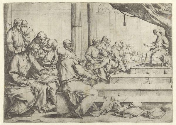This pen and brown ink drawing, titled "Dido and Aeneas," presents us with a scene teeming with classical grandeur and dramatic tension. Immediately, the eye is drawn to the structured composition, a grid-like framework that underlies the artist's rendering of space and form. The architectural elements, rendered with precise lines, create a stage for the unfolding drama, evoking a sense of classical order and balance. Note how the artist uses the architectural lines to divide and frame the characters of Dido and Aeneas. This division is not merely spatial; it suggests a deeper conceptual separation, hinting at themes of love, duty, and inevitable departure. The figures, while rendered with delicate strokes, seem almost frozen in their poses, their gestures laden with symbolic weight. The unfinished quality of the drawing, with its visible gridlines, invites us to consider the creative process itself, a layering of structure and expression. The contrast between the defined architectural elements and the more fluid human forms destabilizes a fixed meaning, suggesting an artwork in constant dialogue with itself.