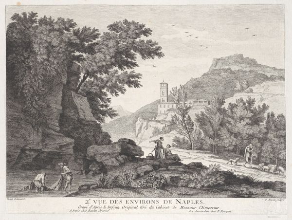 Curator: Let’s take a look at Franz Ludwig Catel’s "View of the Weissenstein Near Cassel," created around 1880. This etching offers us a window into 19th-century Germany and a specific approach to representing landscape and history. Editor: Immediately, I notice how Catel's deployment of contrasting values creates drama. The sharp lines and intricate detail pull the eye toward the illuminated cascade. Curator: Precisely. This etching showcases the Romantic sensibility. What appears at first glance to be simply a picturesque scene, reveals, on closer inspection, a ruin. It’s not merely depicting natural beauty; it also explores themes of memory and the passage of time, a common preoccupation of the era. Editor: And consider how the architectural form of the aqueduct or bridge clashes, yet also harmonizes, with the organic lines of the nature that reclaims it. I am captivated by the geometric starkness softened and overgrown. Note, also, the human figures, almost an aside to the majesty around them, emphasizing nature's grandeur over the human scale. Curator: Yes, and it is crucial to consider the cultural context of such imagery. During this period, the rising tide of nationalism spurred a renewed interest in local histories and legends, quite a change from Classicism. "View of the Weissenstein Near Cassel" encapsulates that very sentiment: it blends nature, national pride, and the contemplation of history, very often of one's own lands, within a single image, a symbol to connect the citizens to their land. Editor: Catel masterfully orchestrated this piece. From the dramatic cascade and complex layering of flora to that crumbling architectural relic in the background—he forces our eyes on an adventurous trek. The entire design is nothing short of virtuosic! Curator: It definitely urges us to look beneath the surface, and past beauty. We're encouraged to ponder about what time has wrought and consider humanity's place within the larger natural order. It presents an interesting study of 19th-century landscape, one tinged with reflection on humanity's past achievements. Editor: A stimulating encounter indeed, as this careful examination highlights.
