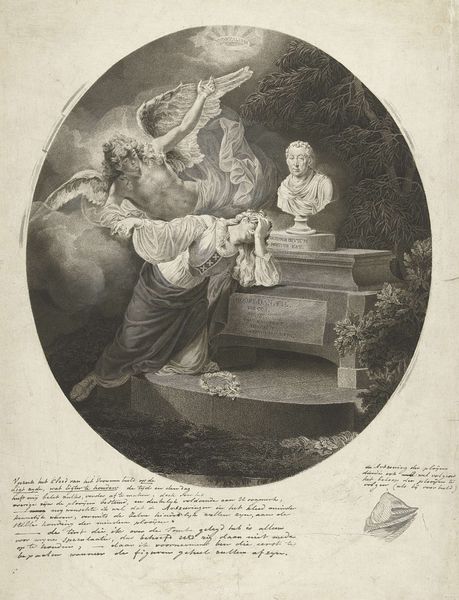 Lambertus Antonius Claessens created this print, ‘Memorieprent voor Hendrik Hooft Daniëlsz’, using an etching technique. The image presents an array of symbols, alluding to themes of grief and transcendence. The weeping woman, slumped in despair, is the embodiment of sorrow, a motif traceable back to ancient funerary art. Above, an angel reaches down, gesturing towards the heavens, symbolizing ascension and divine intervention, a motif that has pervaded Christian art since the early catacombs. Note the bust, an echo of classical portraiture, a physical manifestation of the departed. The way it is presented can be traced back to the Roman tradition of ancestor veneration, linking the deceased to a lineage of virtue. These symbols serve as conduits for expressing profound emotions, tapping into our collective memory of loss and hope. Consider how the gesture of the angel, similar to Nike's iconic pose, triggers associations of victory, now transformed into a triumph over death. Death, grief, immortality – these cyclical concepts echo throughout human history, finding new forms of expression, yet always connected to our deepest fears and aspirations.