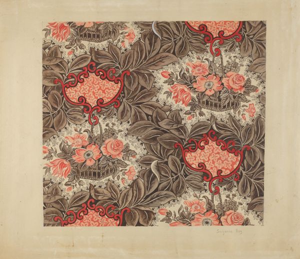 Editor: Here we have Mary Berner's "Bedspread" from around 1936, a drawing and watercolor piece. I find it so charming and delicate. It looks like a pattern for embroidery, maybe? What do you make of it? Curator: Charm is a great word for it, and you're right, there's definitely a naive sweetness to the way these floral motifs are rendered. It's like a garden seen through a child's eyes. I see a certain yearning in this work, a dream of domestic tranquility perhaps, a simple comfort expressed through those colourful flower. Don't you feel that way, too? Editor: Absolutely. There's also this sense of meticulousness. Each square is carefully filled, almost like a sampler. Was it common at the time for artists to design their own bedspreads like this? Curator: Design, embellishment and care in rendering the flora: yes and no. Embroidery samplers were a very traditional pastime for women of this era, of this social status: each element carefully executed and meant to demonstrate knowledge of patterns. The "signature" lies within her palette and selection and execution of favorite colours of flora. The flowers are not hyperrealistic but still suggest care and rendering. Editor: Interesting. So it's not necessarily about pure invention, but about interpretation and personal touch? Curator: Precisely. It makes me think about how even within structured formats, creativity can bloom. What do you think its enduring appeal would be, for our visitors today? Editor: Well, it's just so cheerful and unpretentious. In a world that often feels complicated, these simple flowers offer a little bit of uncomplicated joy. Curator: I agree entirely. It’s a humble offering of beauty, like a quiet, enduring whisper of hope. This was such a breath of fresh air, thank you for that perspective.