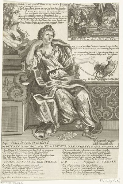 Editor: This is a 17th-century engraving at the Rijksmuseum. It's a portrait of Albrecht III, Duke of Saxony. The duke looks to be directing troops into battle! How should we read into this portrait? Curator: I see this print as more than a historical record; it’s an assertion of power steeped in a very specific moment in the fraught 17th century. He’s positioned, look, seated above what appears to be a battle scene. How is that intended to position the viewer? Editor: So, not just a commemoration, but a calculated message about leadership? The power dynamics and visual language really place Albrecht in control. Curator: Precisely. Consider the setting: he's seated under a draped canopy with a heraldic shield behind him. The light is angled towards him as a form of symbolic stage lighting. What narratives were being enforced, and at whose expense? Editor: The contrast in dress highlights class differences - the armor of the warriors at his feet compared to the elaborate clothing he is wearing, sets the Duke far apart from those fighting. I think his class and power are further highlighted by how passive the Duke looks as he points, compared to those involved in the war scene. He doesn't even have to pick up a weapon to participate. Curator: Indeed, the active, male bodies engaging in war serve as contrast to his own power – in a period where military might often equaled influence, Albrecht positions himself both within and above that narrative. How might ideas of gender also be present? Editor: It sounds like Albrecht's portrayal in this print speaks volumes about not only his power but the values and biases of 17th-century society! Thank you! Curator: And about whose stories get told and how. It’s important to remember the communities affected by the events portrayed and those often left out of conventional historical narratives.