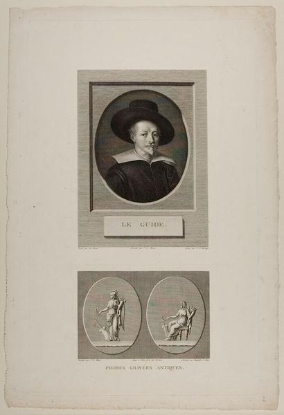Curator: This is Johann Friedrich Bause's engraving of Heinrich Gottfried Koch, part of the Harvard Art Museums collection. Editor: The theatrical mask and trumpet above the portrait are so striking. It gives the sense of performance, almost a celebration of public life. Curator: Indeed. Bause made this engraving to commemorate Koch, who was likely an important figure in theatrical or musical circles. Consider the inscription below with the names Melpomene and Thalia. Editor: The muses of tragedy and comedy! The ivy twining around the oval frame could be a reference to artistic dedication, or even immortality. Curator: Koch's social role then was clearly one tied to the arts. Portrait engravings like these served a crucial role in disseminating images of notable figures. Editor: The choice of symbols, though, elevates the individual. It's not just a likeness; it's an idealization of his cultural impact. Curator: And that’s so telling about the value placed on the arts in the period. Editor: It does make you wonder about the real Heinrich Gottfried Koch. What was he like? The engraving only gives us an idealized representation.