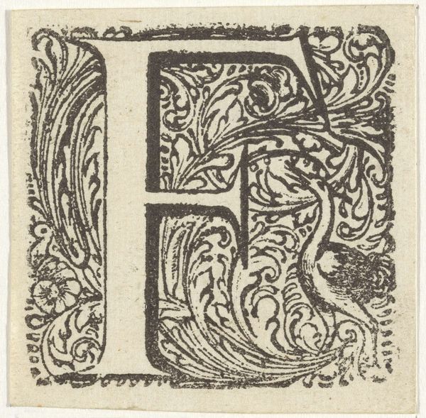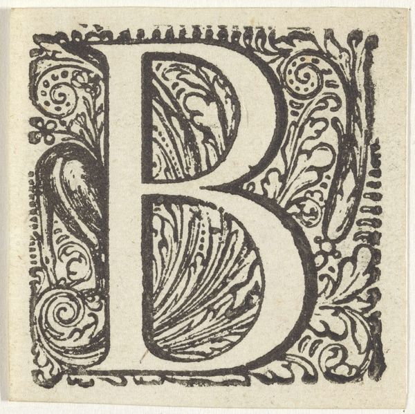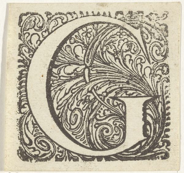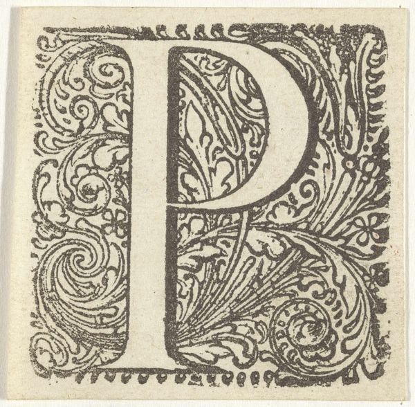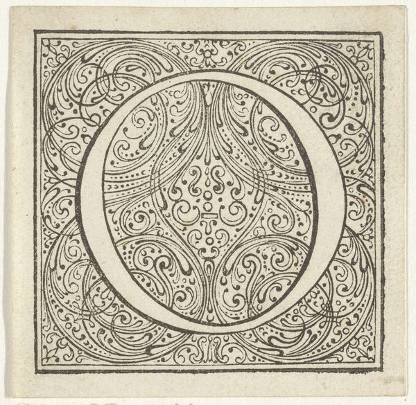 This is an ornamented 'O' in black ink, made by an anonymous artist. The image is a fascinating study in form and contrast, where a simple letter is transformed into a complex visual field. The letter 'O' itself is meticulously filled with swirling botanical patterns, immediately drawing the eye into a dance of lines and shapes. These organic forms create a tension between the rigid structure of the letter and the free-flowing designs within. The contrast between the dense, ornamented interior and the clean, unadorned space surrounding the letter highlights the interplay of figure and ground. Viewed through the lens of structuralism, the 'O' operates as a sign, its conventional meaning destabilized by its elaborate decoration. The work invites us to consider how even the most basic elements of language can be infused with layers of artistic and cultural significance. It's a reminder that even within rigid systems, there's always room for play, interpretation, and reinvention.